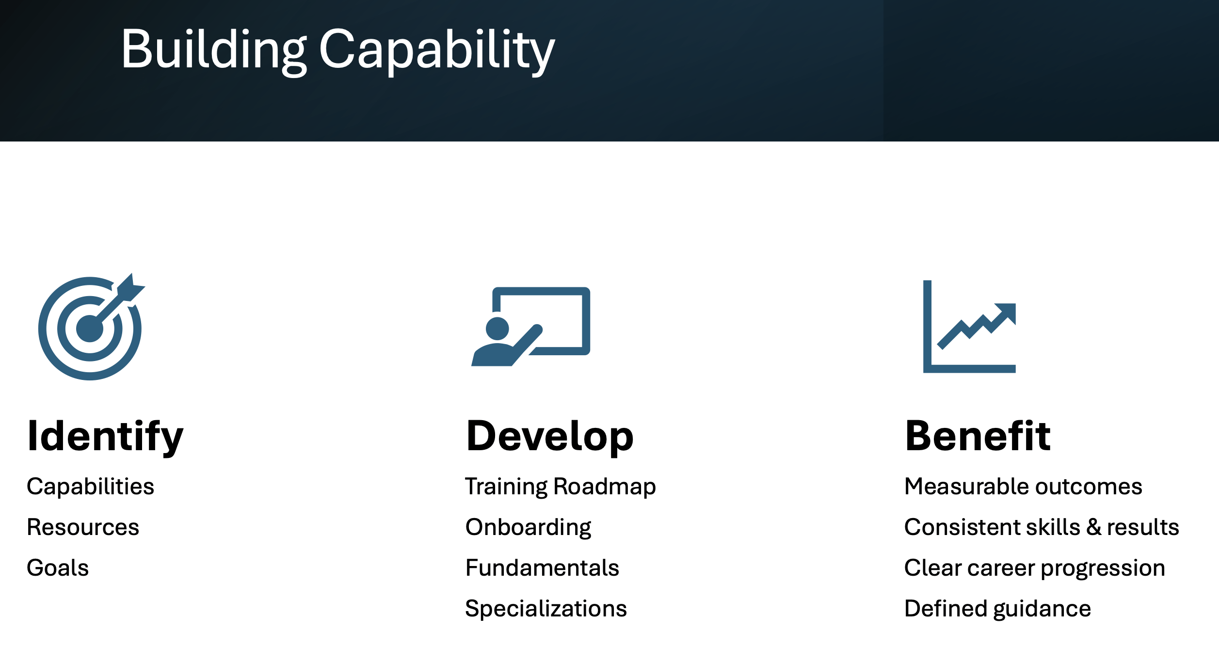 Building true capability starts with understanding where your team stands today. That means identifying existing skills, resources, and goals—what’s working, what’s missing, and where you want to be in the next few months.