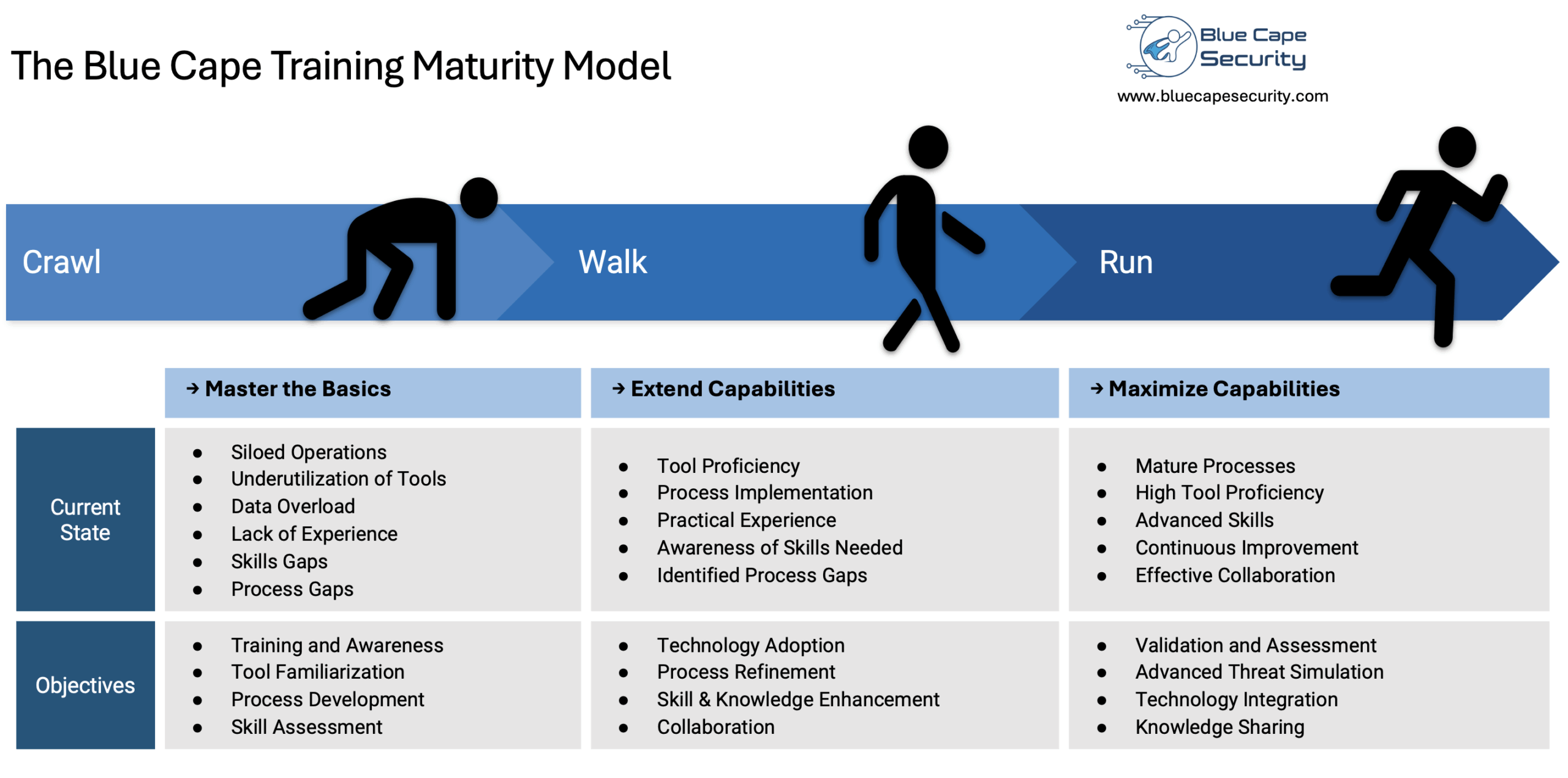 After guiding multiple organizations through this transformation, we began to recognize a consistent pattern—recurring challenges at each stage and clear objectives that defined progress. This insight led us to formalize the Blue Cape Security Training Maturity Model, a structured framework for developing people, processes, and capabilities over time.